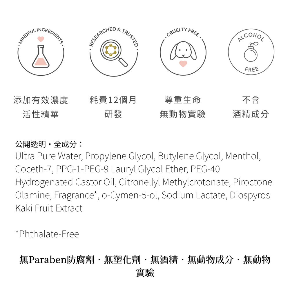 不含paraben防腐劑、酒精、EDTA、色素、塑化劑、藥物成分